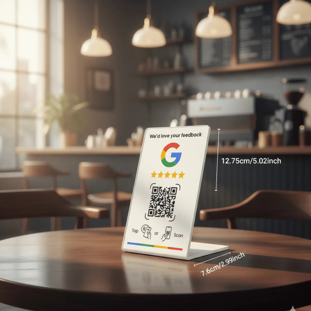 Whether you run a café, salon, retail store, or any customer-facing business, this stand transforms satisfied clients into powerful social proof – boosting your online reputation, credibility, and search visibility.